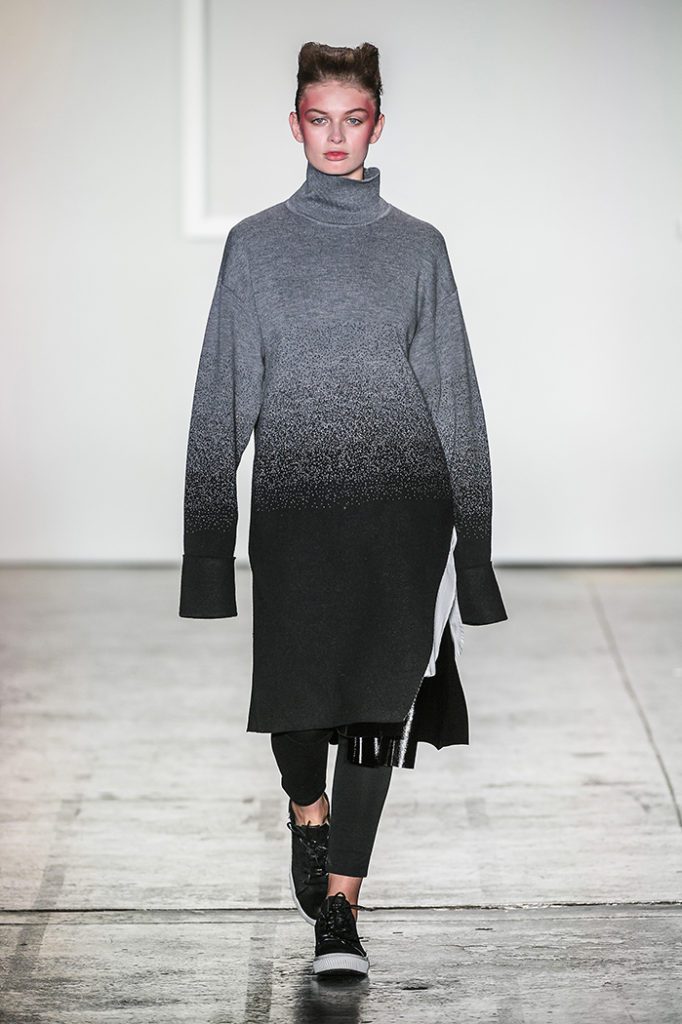 For his Fall Winter collection, Harrison Wong turned to Mark Rothko, the mid-20th Century abstract expressionist whose powerful paintings are comprised of blurred blocks of vibrant colors with blacks and greys, for inspiration. Wong crafted fields of gradient tones as prints and patterns to complement and magnify the lines of his fitted overcoats and oversized sweatshirts. His menswear and womenswear creations were layered in unique fashions by altering sizes, vests, and pops of electric blue and orange hues. Sharp cutouts and puffer materials contrasted the soft ambience of Wong’s tonal, gradient knitwear. By adding a sportswear element to his signature modern classic style, Harrison Wong created stunning looks with a wearable, immediate appeal.