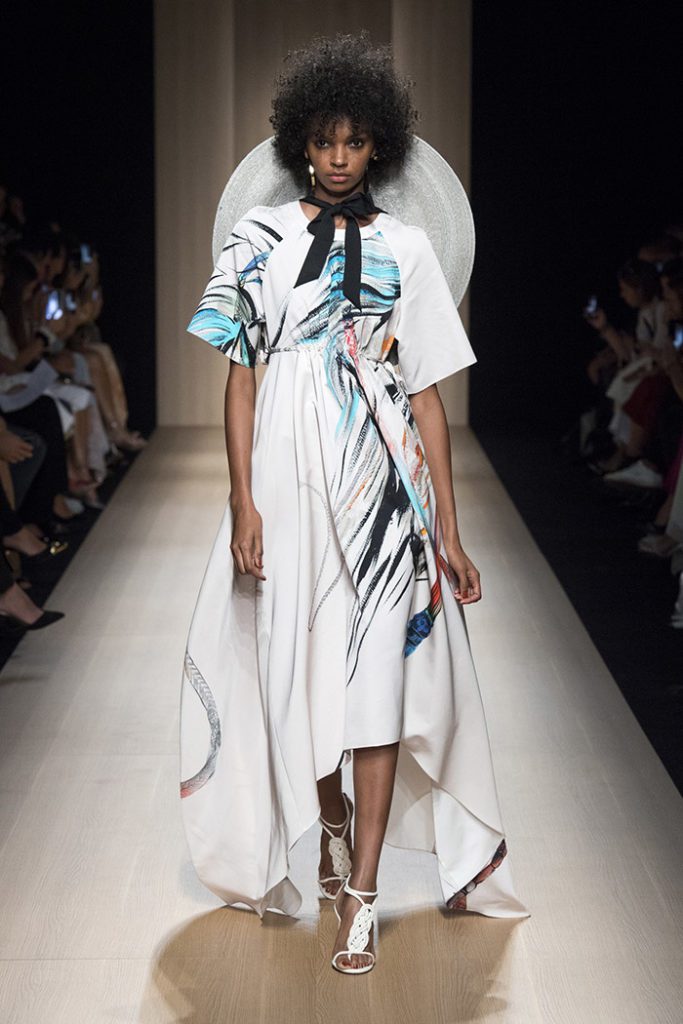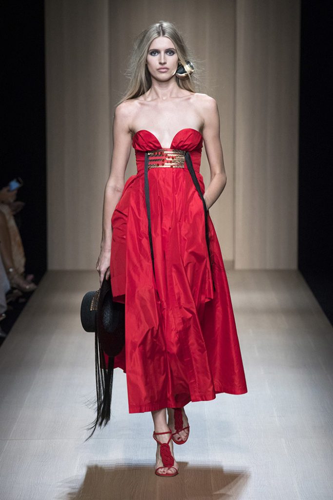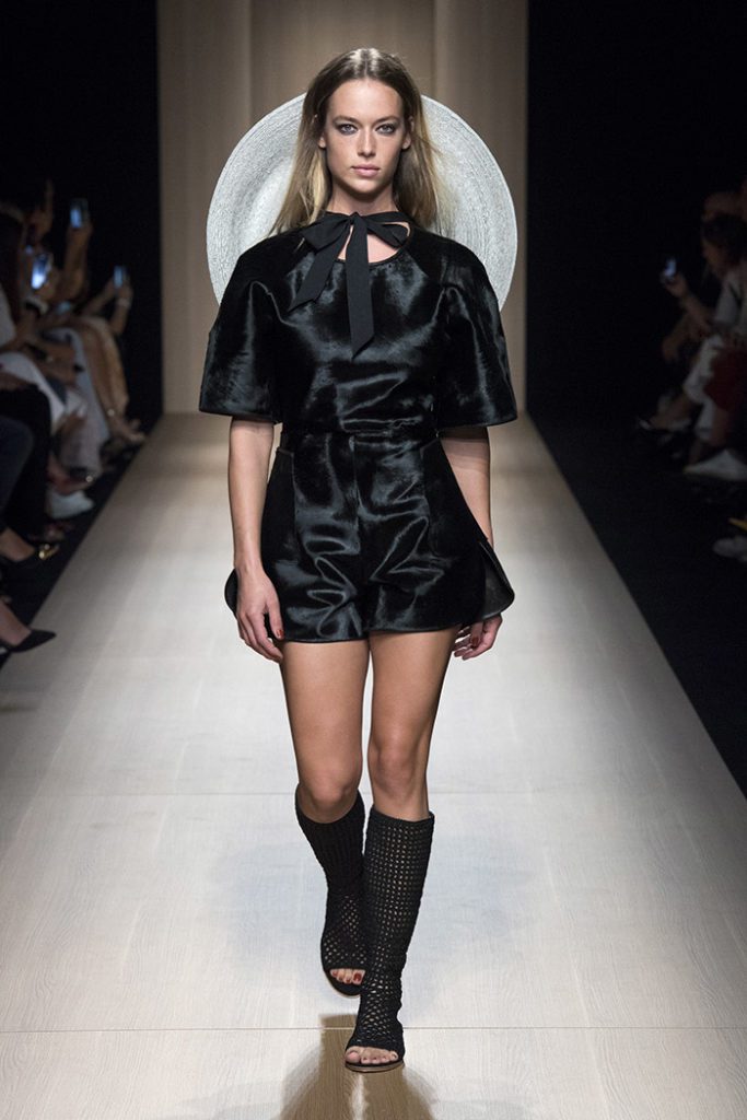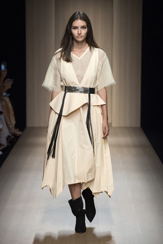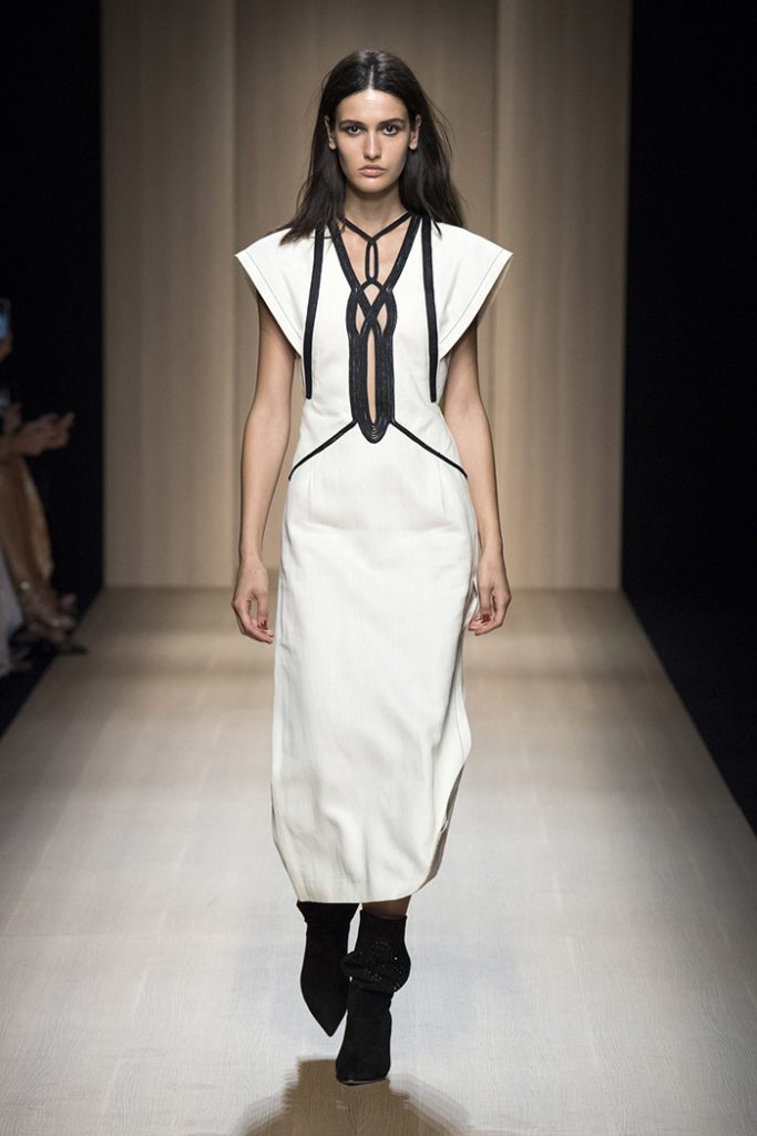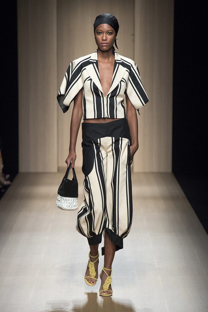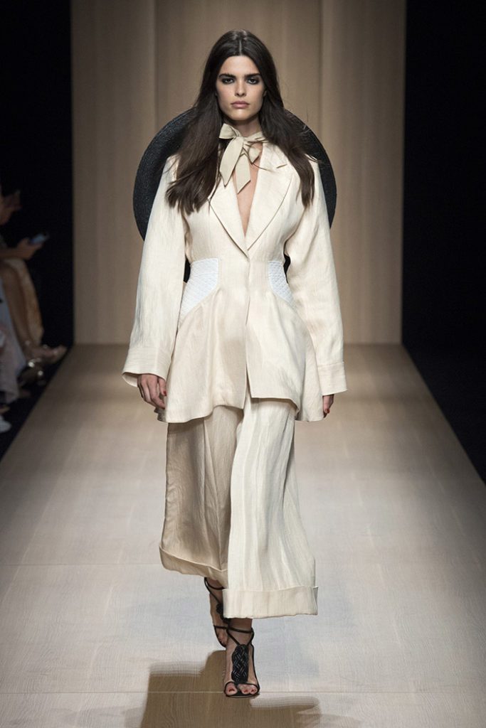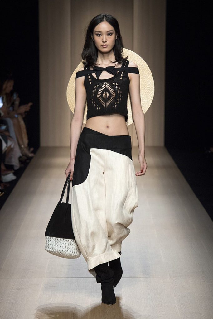 Sinuous shapes and curved volumes steal the spotlight with both ankle-lenght pants paired with little vests and dresses with fitted bodices and roomy bottom parts.