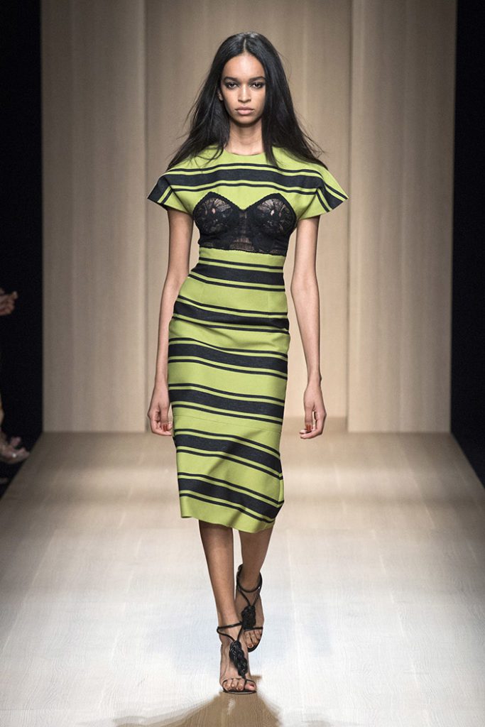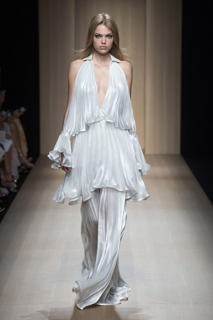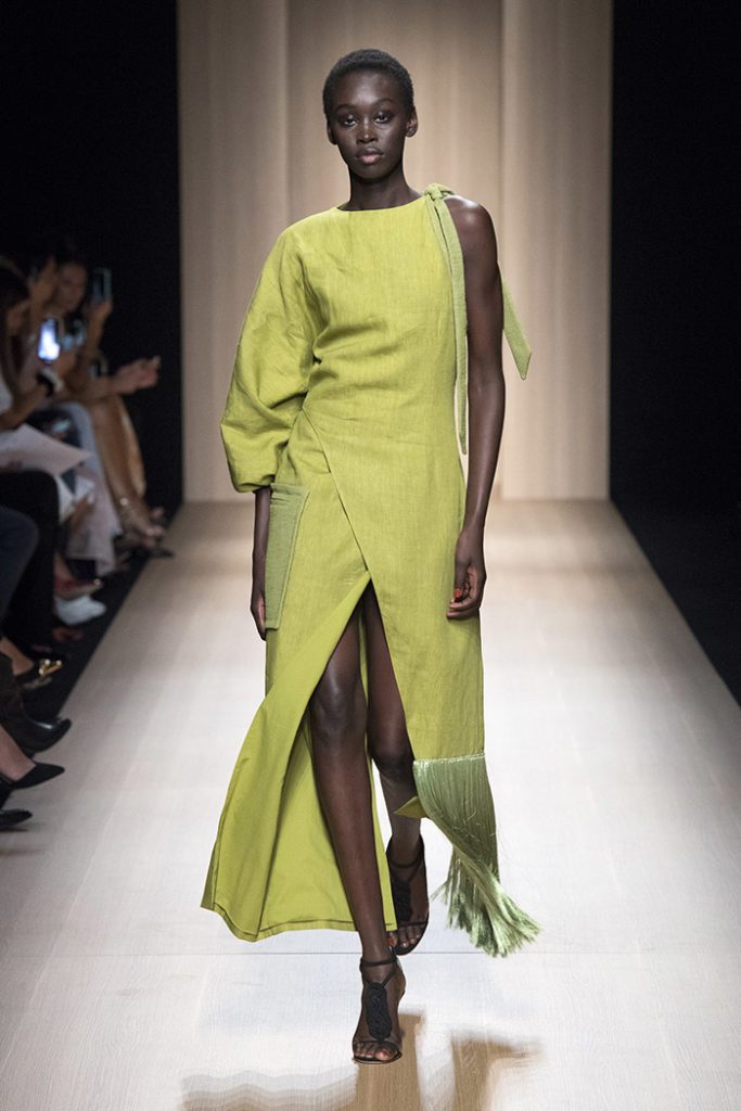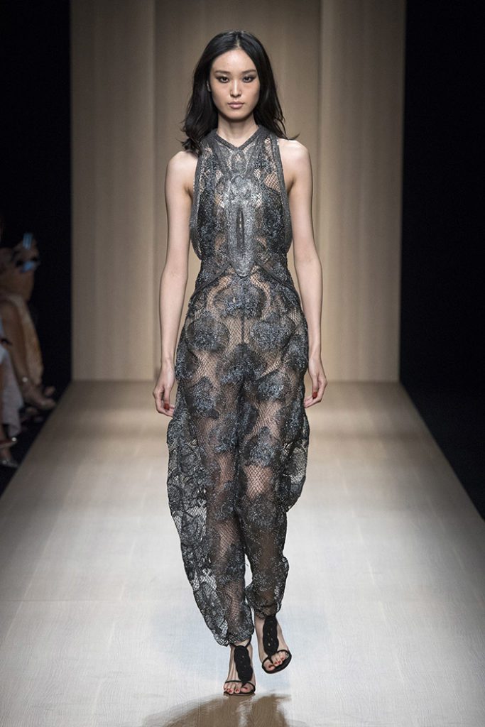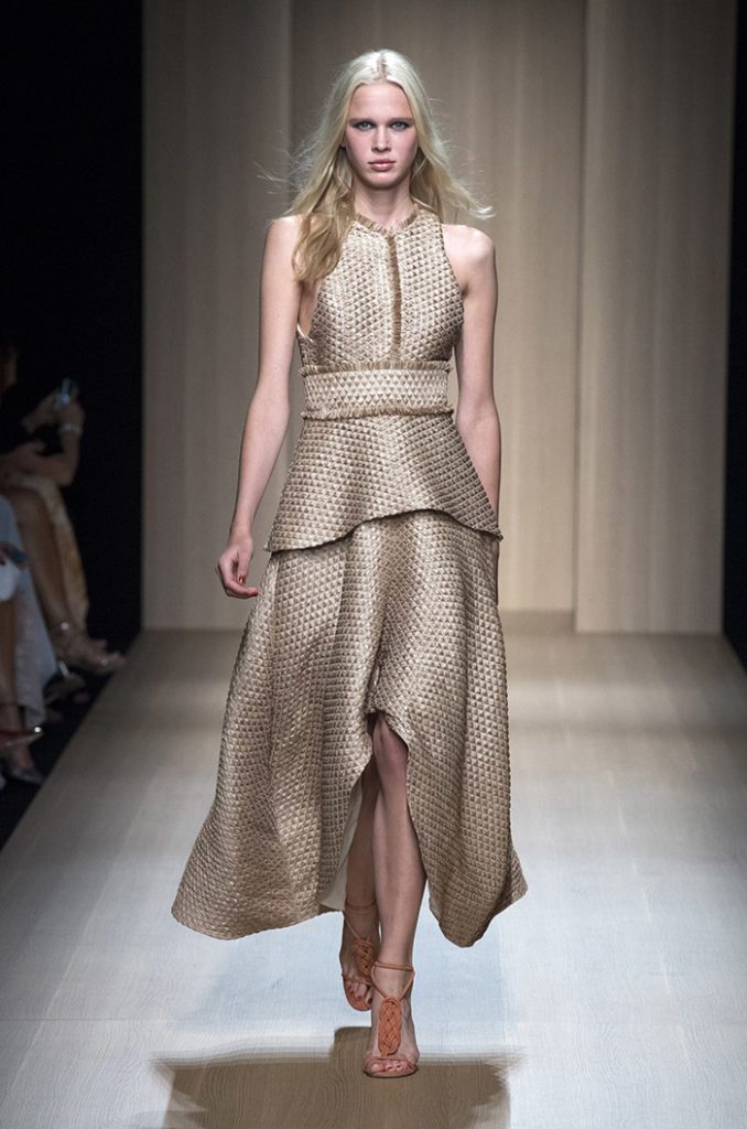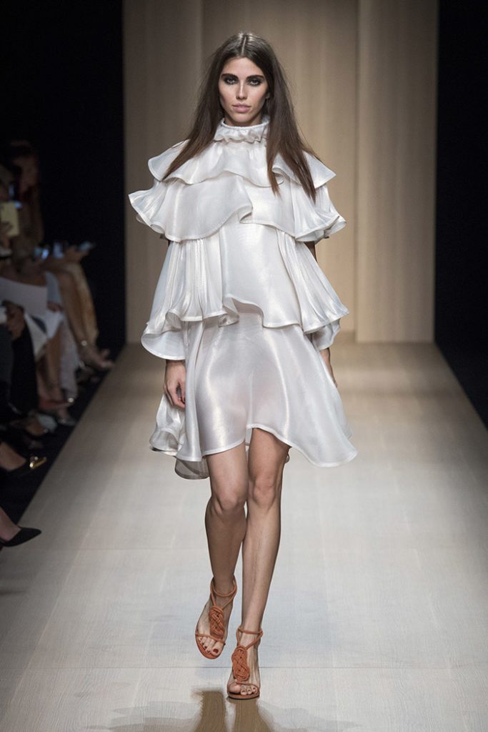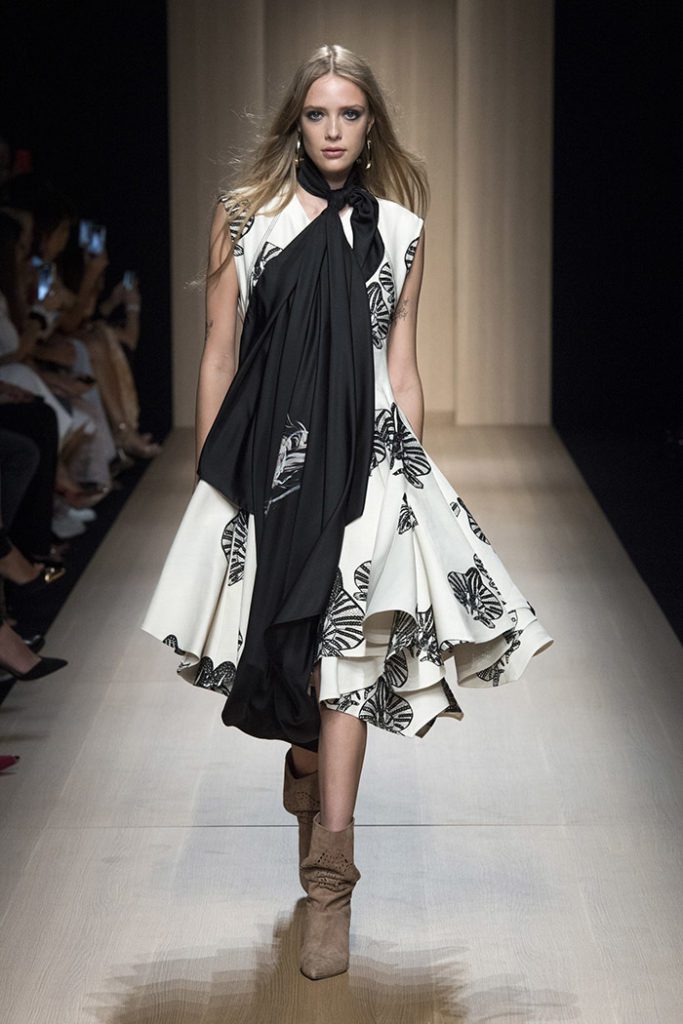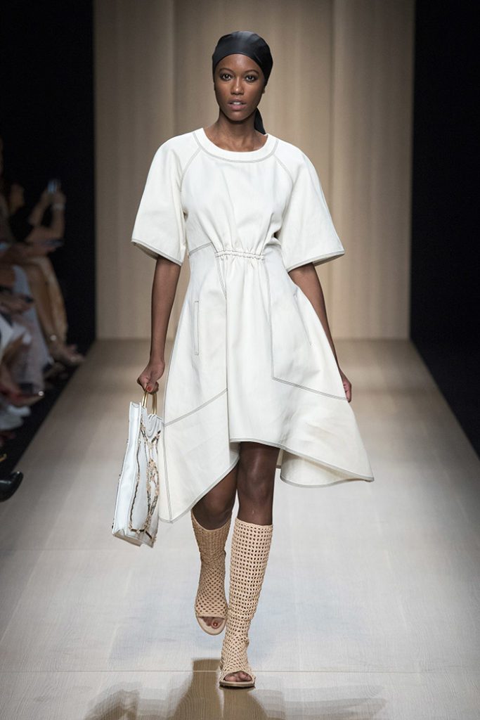 Sinuous shapes and curved volumes steal the spotlight with both ankle-lenght pants paired with little vests and dresses with fitted bodices and roomy bottom parts.