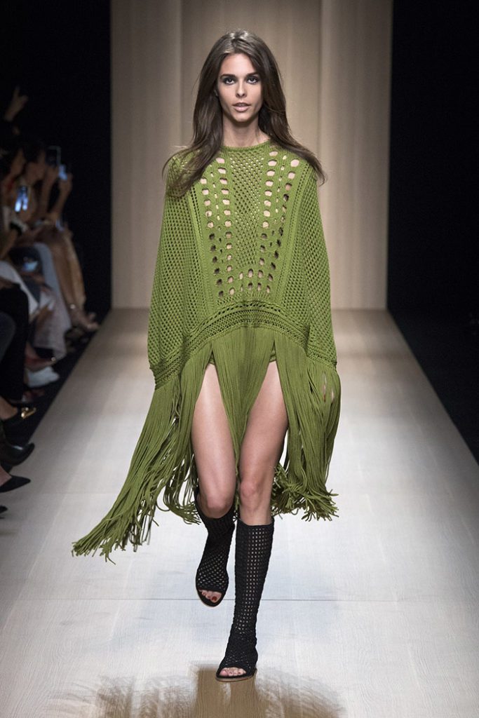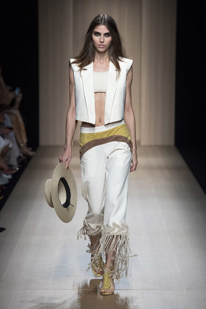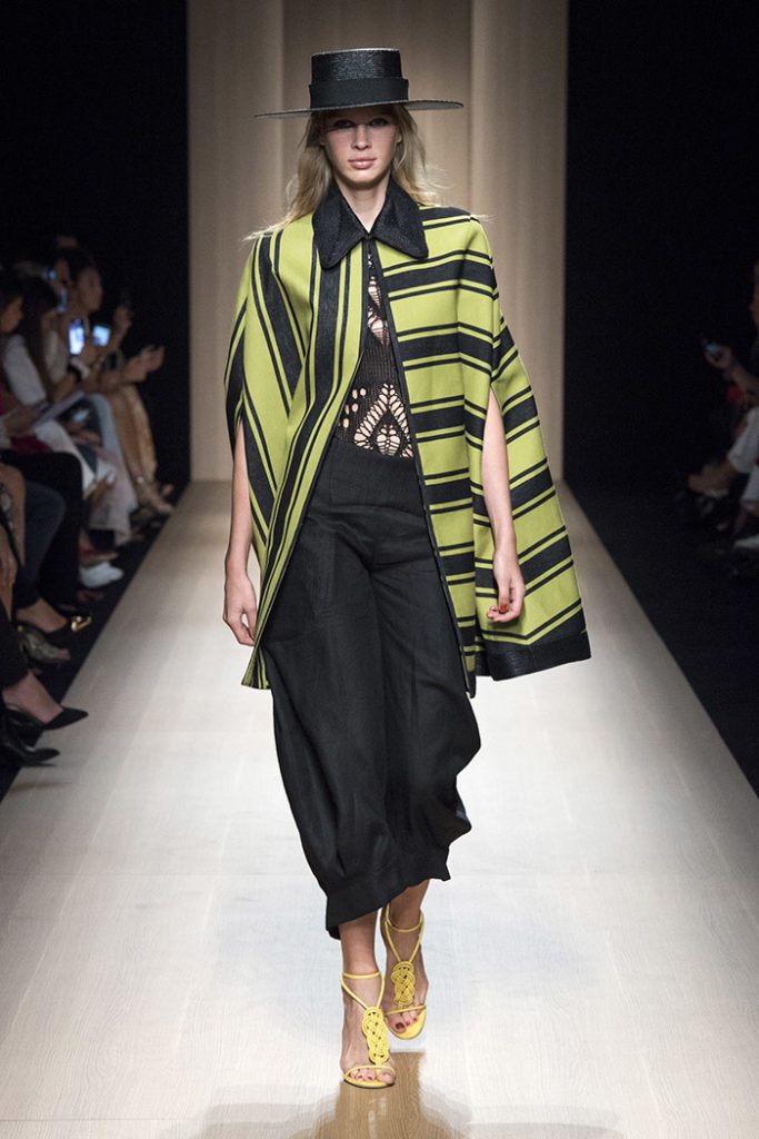 Cotton fringes embellish a linen jacket, while gauchos’ classic poncho is revisited for a green and black version.