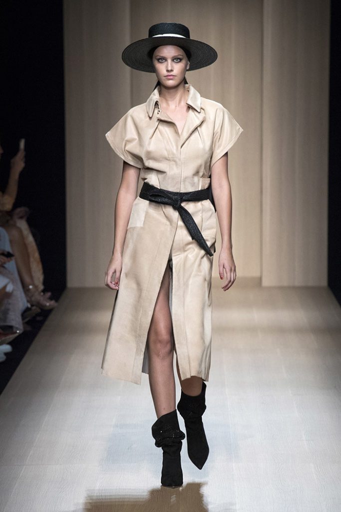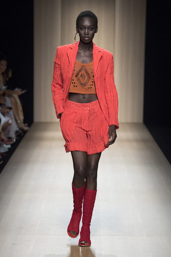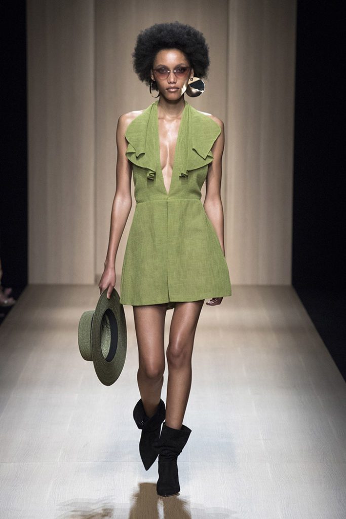 Fabrics and colors exalt the collection’s natural mood. The colors of the Argentinian spices – paprika, nutmeg, turmeric, white sesame, black pepper – meet the tactile textures of natural fabrics. Dresses which put the focus on the waist and mini jumpsuits are crafted from raffia, while a trench punctuated by ruffles on the sleeves comes in linen.
