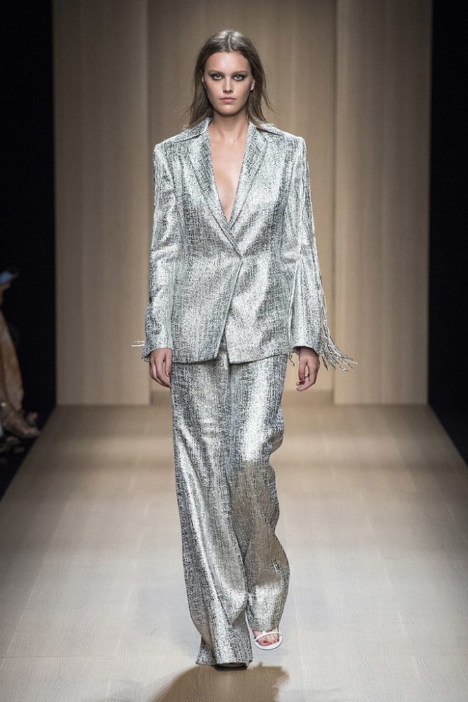 Silver jacquard suits are punctuated by fringes and precious beaded embroideries.