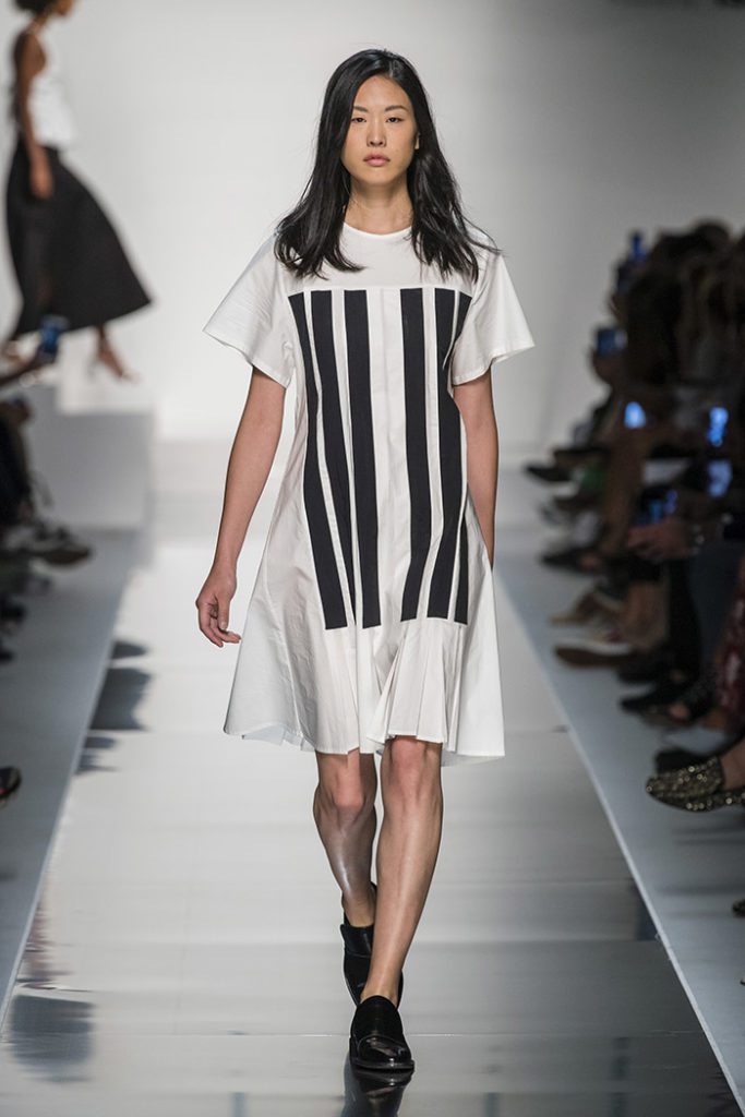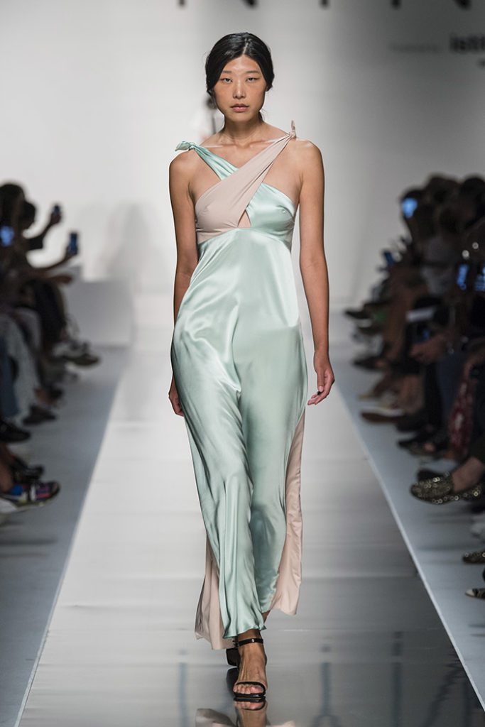 Finally, the much-loved Clara monochrome, elongating panelled dress is accessorised with a crisp white belt and introduced in nightgown feminine soft tones on silky satin fabrics, finished with chiffon bell bottom sleeves.