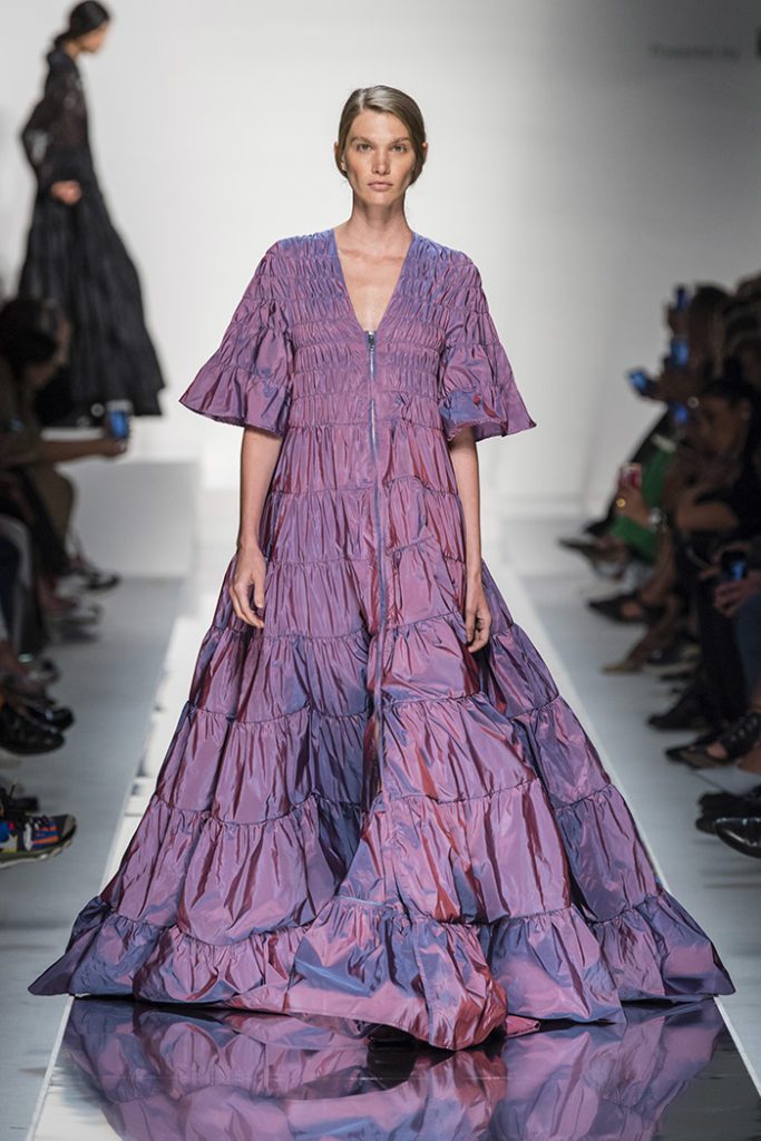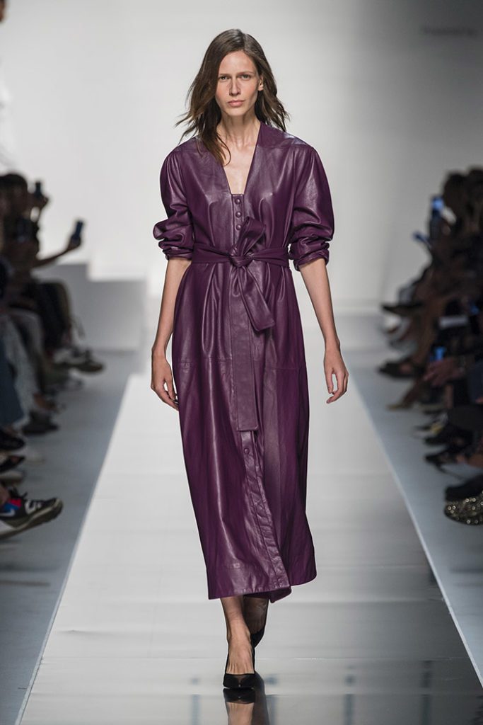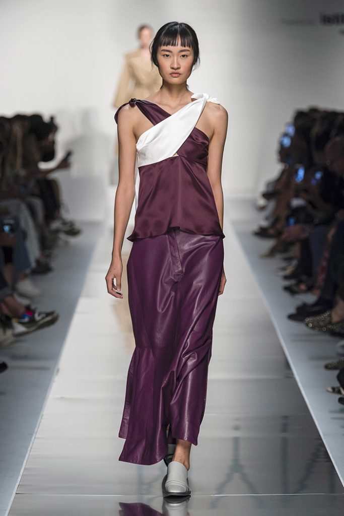 The collection builds on the exaggerated figures from the decade’s fashions modifying details to better facilitate the modern woman, with returning designs from their debut AW19 collection such as the recurring Diana ruched gown is softened by chiffon fabrics and pastel tones, along with the Meryl shirt. It’s an unveiling of updated guidelines for power dressing, where statement pieces of floor-length leather build contrasting panel dresses in crisp white and rich aubergine.